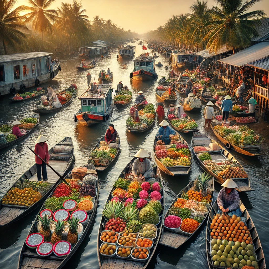 Der größte und bekannteste schwimmende Markt ist der Cai Rang Markt bei Can Tho, der früh am Morgen stattfindet. Hier schaukeln hunderte von Booten auf dem Wasser, beladen mit exotischen Früchten wie Drachenfrucht, Mango, Durian und Papaya. Händler und Käufer rufen ihre Angebote laut über das Wasser, während sie ihre Boote manövrieren. Touristen haben die Möglichkeit, eine Bootsfahrt zu unternehmen, um diesen pulsierenden Markt aus nächster Nähe zu erleben und lokale Spezialitäten wie frische Kokosnüsse oder frisch zubereitete Nudelsuppen direkt vom Boot aus zu kosten.